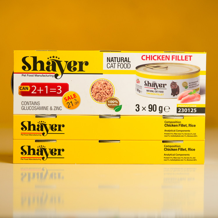 کنسرو گربه شایر با طعم فیله ی مرغ ، شامل تکه های فیله ی مرغ همراه با برنج ، فاقد شکر و نمک و گلوتون می باشد.به دلیل وجود گلوکوزامین و زینک باعث استحکام استخوان های گربه می شود.این کنسرو باعث بهبود عملکرد دستگاه گوارش و کمک به سیستم ایمنی بدن است.