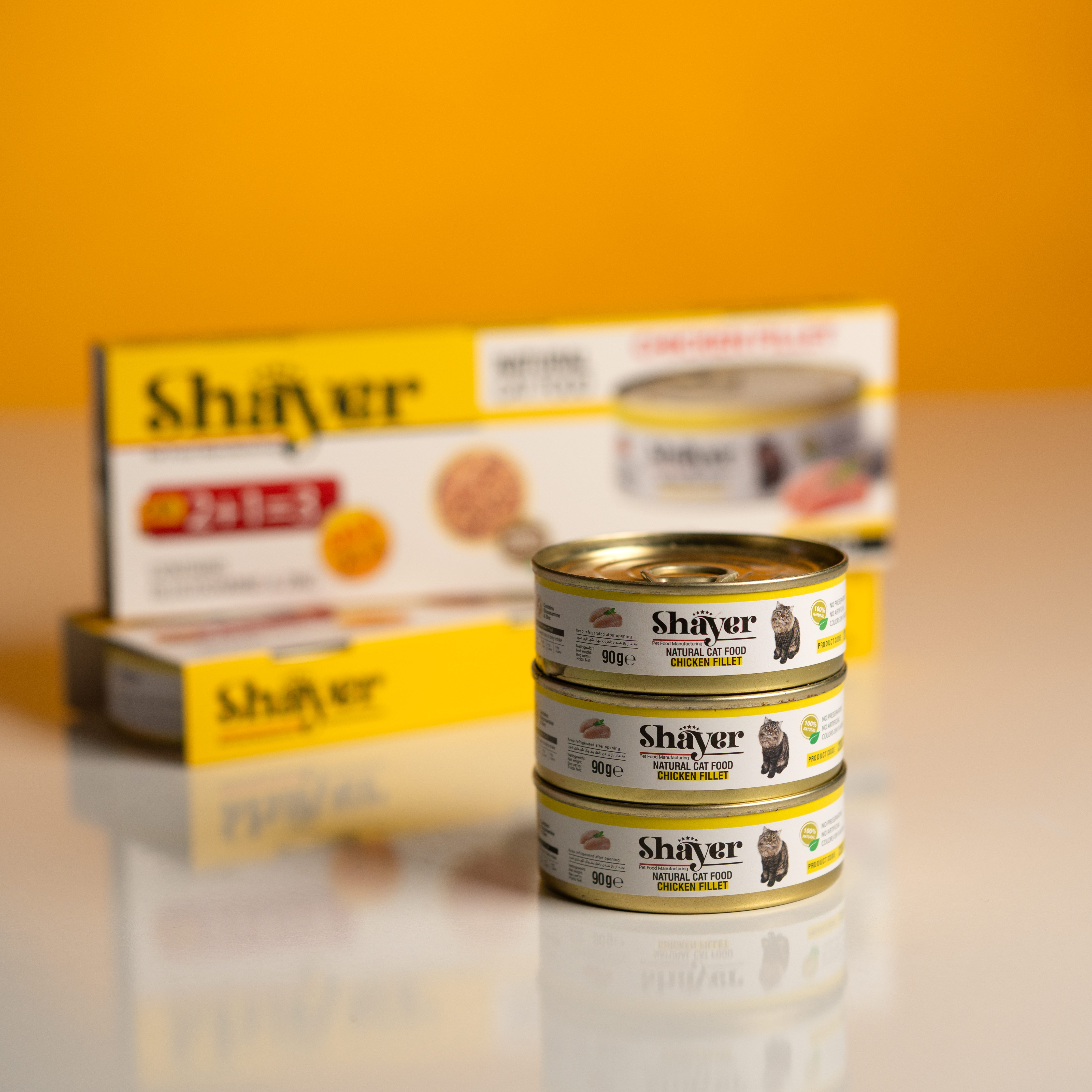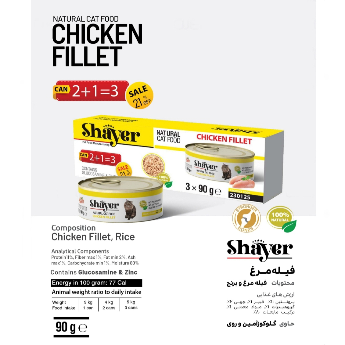 کنسرو گربه شایر با طعم فیله ی مرغ ، شامل تکه های فیله ی مرغ همراه با برنج ، فاقد شکر و نمک و گلوتون می باشد.به دلیل وجود گلوکوزامین و زینک باعث استحکام استخوان های گربه می شود.این کنسرو باعث بهبود عملکرد دستگاه گوارش و کمک به سیستم ایمنی بدن است.