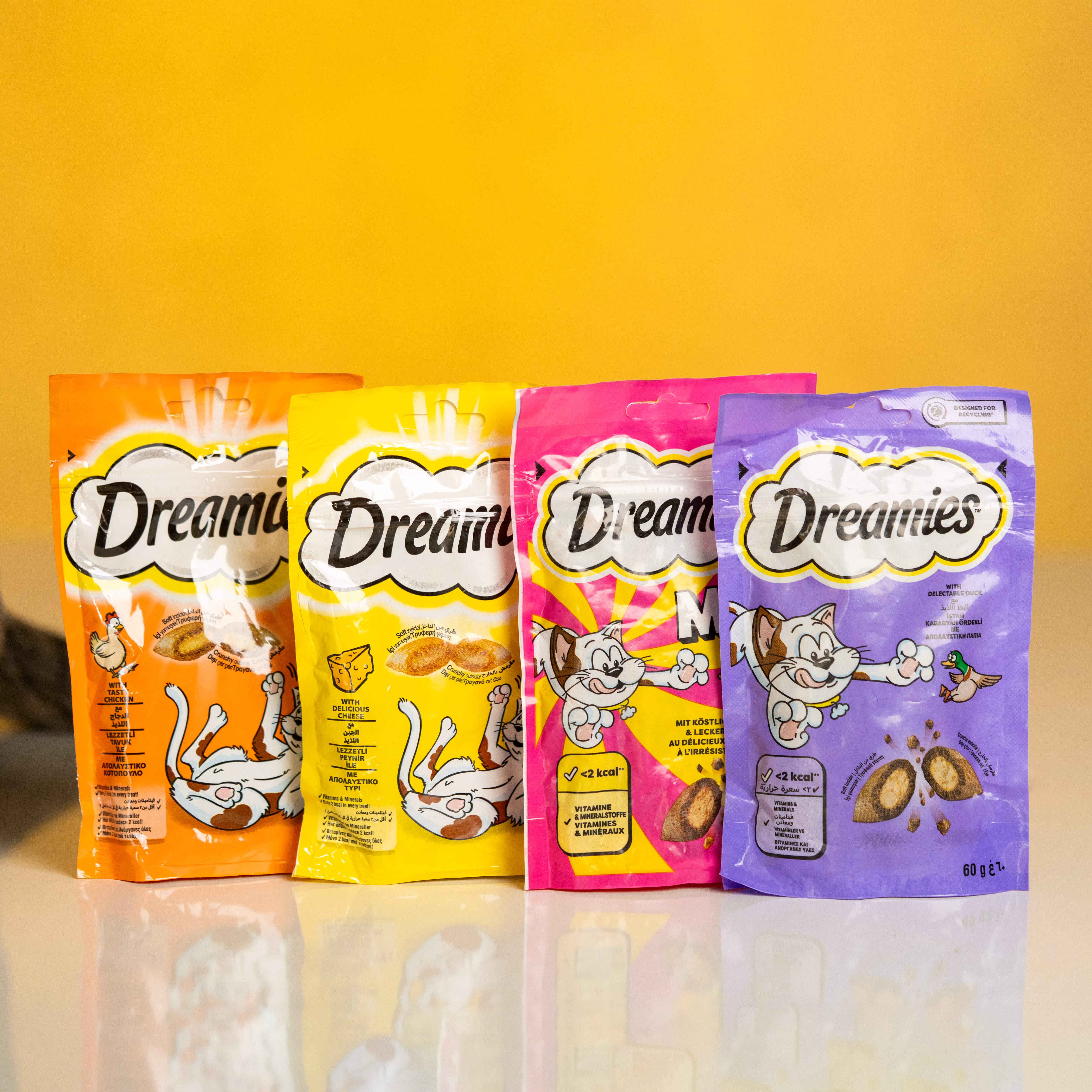 برند تشویقی دریمیز بسیار خوش خوراک و محبوب بین گربه هاست ، روکش ترد و کرانچی و مغز نرم و لذیذ آن باعث علاقه ی گربه هاست.